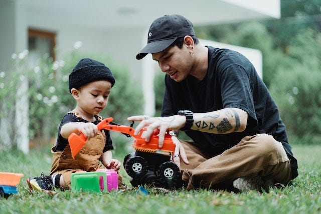 Mostly, whatever they want to do (as long as it’s safe). Remember, this is child-led time. You imitate them. You describe what they’re doing. You play the game they want to play, even if you can’t stand it. (For example, Catherine can’t stand playing Monster Trucks - jumping and crashing them over and over and over. But she does it anyway. For Glenn it’s playing dolls and makeup - because babies and beauty are a girl’s lot in life, right?🤦♂️).