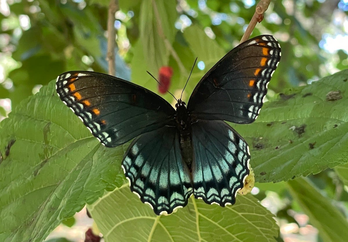 I’d been seeing these beautiful black and blue butterflies for weeks, but every time I tried to get close for a picture they would fly away. I was finally able to get this shot because the Mulberries were ripe and this lady was so engrossed in eating that she completely ignored me. (I’m not sure what Mulberry variety this tree was, but they were delicious!)
